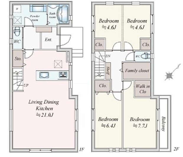 間取り内訳:リビングダイニングキッチン 21帖(1階)・洋室 7.7帖(2階)・洋室 6.4帖(2階)・洋室 4.6帖(2階)・洋室 4.6帖(2階)