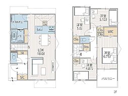 間取り内訳:リビングダイニングキッチン 18帖(1階)・洋室 6.7帖(2階)・洋室 5.1帖(2階)・洋室 5帖(2階)・洋室 4.8帖(2階)
