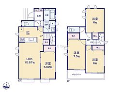 | 間取り | 4LDK 間取り内訳:リビングダイニングキッチン 20帖(1階)・洋室 6.4帖(2階)・洋室 6帖(2階)・洋室 5.3帖(2階)・洋室 5.3帖(2階) |