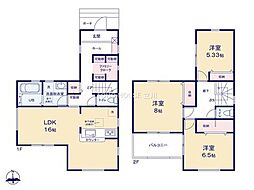 | 間取り | 4LDK(ウォークインクローゼット2帖) 間取り内訳:リビングダイニングキッチン 16帖(1階)・和室 4.5畳(1階)・洋室 8帖(2階)・洋室 6.5帖(2階)・洋室 6帖(2階) |