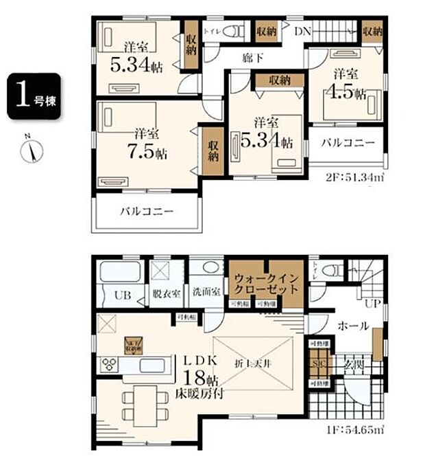 間取り内訳:リビングダイニングキッチン 18帖(1階)・洋室 7.5帖(2階)・洋室 5.3帖(2階)・洋室 5.3帖(2階)・洋室 4.5帖(2階)
