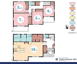 間取り内訳:リビングダイニングキッチン 18帖(1階)・洋室 7.5帖(2階)・洋室 5.3帖(2階)・洋室 5.3帖(2階)・洋室 4.5帖(2階)