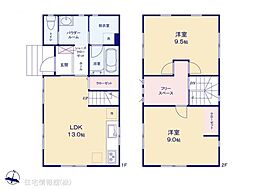 | 間取り | 2LDK 間取り内訳:リビングダイニングキッチン 13帖(1階)・洋室 9.5帖(2階)・洋室 9帖(2階) |