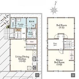 | 間取り | 2LDK 間取り内訳:リビングダイニングキッチン 13帖(1階)・洋室 9.5帖(2階)・洋室 9帖(2階) |