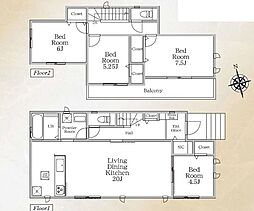 | 間取り | 4LDK 間取り内訳:リビングダイニングキッチン 20帖(1階)・洋室 4.5帖(1階)・洋室 6帖(2階)・洋室 5.2帖(2階)・洋室 7.5帖(2階) |