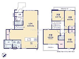 | 間取り | 4LDK 間取り内訳:リビングダイニングキッチン 20帖(1階)・洋室 8帖(2階)・洋室 6帖(2階)・洋室 5.3帖(2階)・洋室 5.3帖(2階) |
