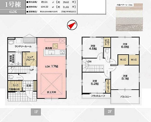 間取り内訳:リビングダイニングキッチン 17帖(1階)・洋室 4.5帖(2階)・洋室 6.8帖(2階)・洋室 8.1帖(1階)・洋室 5.2帖(2階)