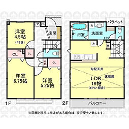 間取り内訳:リビングダイニングキッチン 18帖(2階)・洋室 4.5帖(1階)・洋室 5.2帖(1階)・洋室 6.7帖(1階)