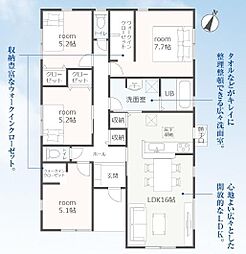 | 間取り | 4LDK 間取り内訳:リビングダイニングキッチン 16帖(1階)・洋室 7.7帖(1階)・洋室 5.2帖(1階)・洋室 5.2帖(1階)・洋室 5.1帖(1階) |