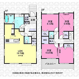 | 間取り | 3LDK 間取り内訳:リビングダイニングキッチン 19.7帖(1階)・洋室 10.2帖(2階)・洋室 6.1帖(2階)・洋室 5.4帖(2階) |