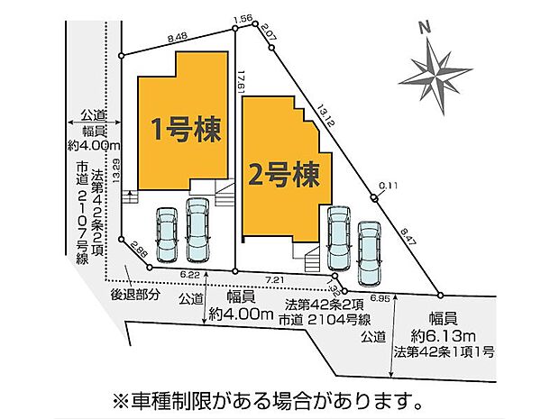1号棟:南4m 北西4m /2号棟:南4m