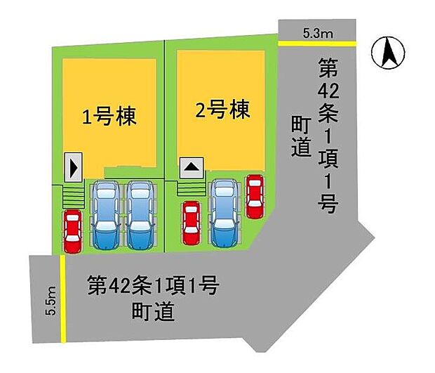 2号棟:南5.5m 東5.3m /1号棟:南5.5m