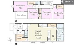 | 間取り | 3SLDK 間取り内訳:リビングダイニングキッチン 18帖(1階)・洋室 6帖(2階)・洋室 4.8帖(2階)・洋室 4.8帖(2階)・収納 5.2帖(2階) |
