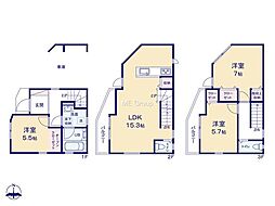 | 間取り | 3LDK 間取り内訳:洋室 5.5帖(1階)・リビングダイニングキッチン 15.3帖(2階)・洋室 7帖(3階)・洋室 5.7帖(3階) |