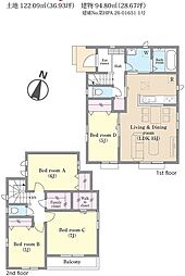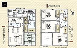 | 間取り | 5LDK(+ウォークインクローゼット) 間取り内訳:リビングダイニングキッチン 15.7帖(1階)・洋室 5.2帖(1階)・洋室 8帖(2階)・洋室 5.4帖(2階)・洋室 5.1帖(2階)・洋室 5帖(2階) |