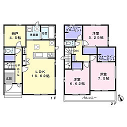 | 間取り | 3SLDK 間取り内訳:リビングダイニングキッチン 16.6帖(1階)・収納 4.5帖(1階)・洋室 7.5帖(2階)・洋室 6.6帖(2階)・洋室 5.2帖(2階) |