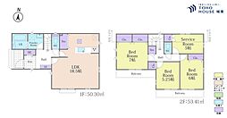 | 間取り | 3SLDK 間取り内訳:リビングダイニングキッチン 17.5帖(1階)・洋室 6.7帖(2階)・洋室 6.7帖(2階)・洋室 5帖(2階)・収納 4.5帖(2階) |