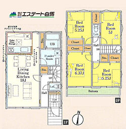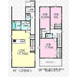 | 間取り | 4LDK 間取り内訳:リビングダイニングキッチン 18帖(1階)・洋室 5帖(2階)・洋室 5.2帖(2階)x2・洋室 6.3帖(2階) |