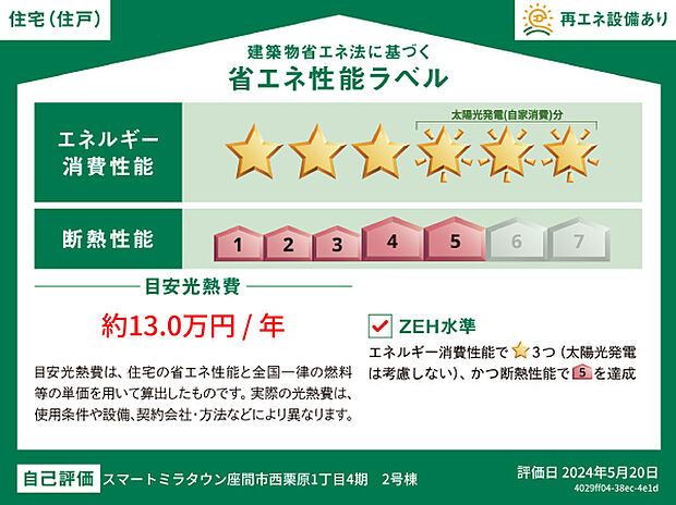 星マークの数が多いほどエネルギー消費性能が高いことを示しています。再エネ設備のない住宅は★0~★4の5段階評価、再エネ設備がある住宅は★0~★6の7段階評価となります。