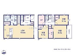 間取り内訳:リビングダイニングキッチン 18.2帖(1階)・洋室 5帖(2階)・洋室 6.6帖(2階)・洋室 6.6帖(2階)・洋室 4.5帖(2階)・洋室 5.1帖(2階)