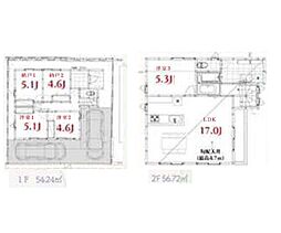 | 間取り | 3SLDK 間取り内訳:洋室 5.1帖(1階)・洋室 4.6帖(1階)・収納 4.6帖(1階)・収納 5.1帖(1階)・洋室 5.3帖(2階)・リビングダイニングキッチン 17帖(2階) |