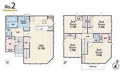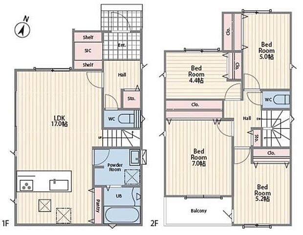 間取り内訳:リビングダイニングキッチン 17帖(1階)・洋室 7帖(2階)・洋室 5.2帖(2階)・洋室 5帖(2階)・洋室 4.4帖(2階)