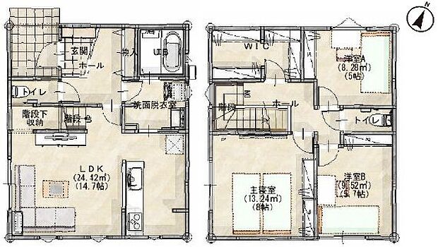 | 間取り | 3LDK 間取り内訳:リビングダイニングキッチン 14.7帖(1階)・洋室 8帖(2階)・洋室 5.7帖(2階)・洋室 5帖(2階) |