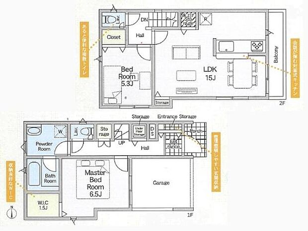 間取り内訳:洋室 6.5帖(1階)・洋室 5.3帖(2階)・リビングダイニングキッチン 15帖(2階)