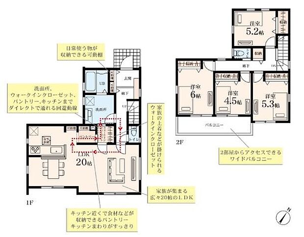 間取り内訳:リビングダイニングキッチン 20帖(1階)・洋室 6帖(2階)・洋室 4.5帖(2階)・洋室 5.3帖(2階)・洋室 5.2帖(2階)