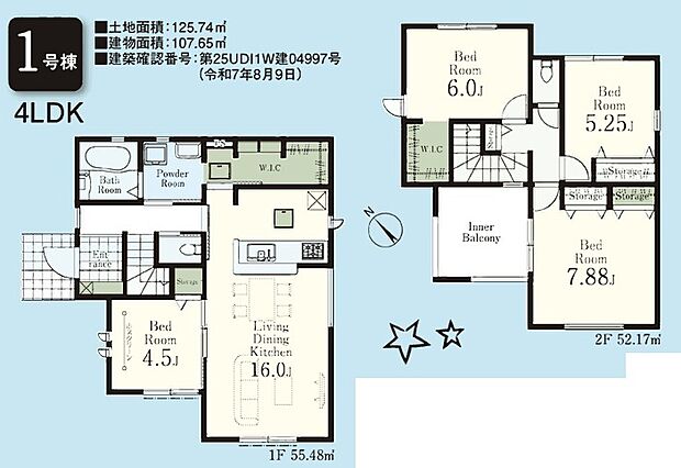 | 間取り | 4LDK 間取り内訳:リビングダイニングキッチン 16帖(1階)・洋室 4.5帖(1階)・洋室 5.2帖(2階)・洋室 6帖(2階)・洋室 7.8帖(2階) |