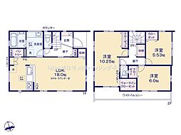 | 間取り | 3LDK(※LDK21帖に畳コーナー3帖含む。) 間取り内訳:リビングダイニングキッチン 21帖(1階)・洋室 7.8帖(2階)・洋室 5.3帖(2階)x2 |
