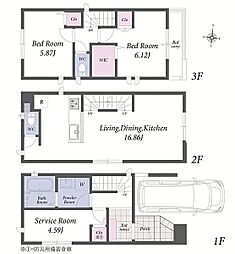 | 間取り | 3LDK 間取り内訳:リビングダイニングキッチン 16帖(2階)・洋室 5帖(1階)・洋室 7帖(3階)・洋室 6.5帖(3階) |