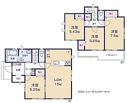 間取り内訳:リビングダイニングキッチン 16帖(1階)・洋室 5.2帖(1階)・洋室 7.5帖(2階)・洋室 5.2帖(2階)x2