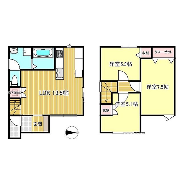 | 間取り | 3LDK 間取り内訳:リビングダイニングキッチン 13.5帖・洋室 7.5帖・洋室 5.3帖・洋室 5.1帖 |