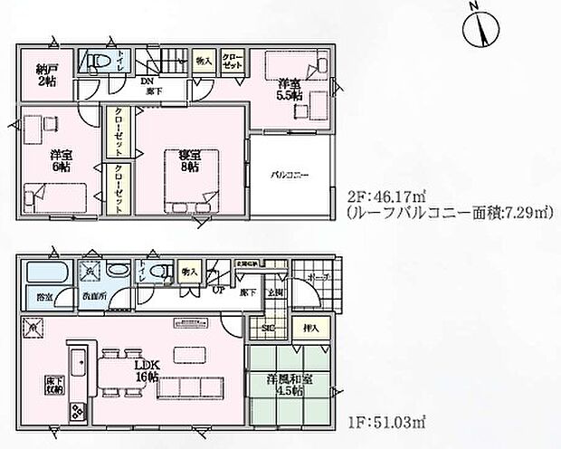 間取り内訳:リビングダイニングキッチン 16帖(1階)・和室 4.5畳(1階)・洋室 8帖(2階)・洋室 6帖(2階)・洋室 5.5帖(2階)・収納 2帖(2階)