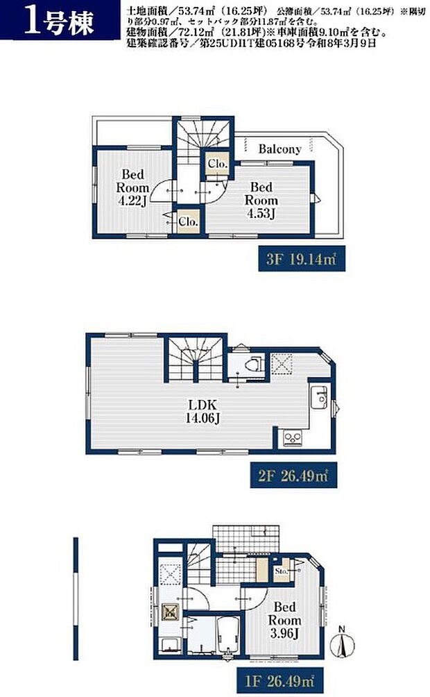 | 土地面積 | 53.74m2(隅切り部分0.97m2、セットバック部分11.87m2を含む) | ||