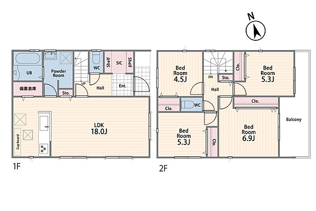| 間取り | 4LDK 間取り内訳:リビングダイニングキッチン 18帖(1階)・洋室 6.9帖(2階)・洋室 5.3帖(2階)x2・洋室 4.5帖(2階) |