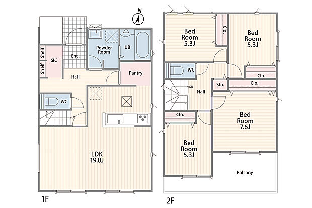 | 間取り | 4LDK 間取り内訳:リビングダイニングキッチン 19帖(1階)・洋室 7.6帖(2階)・洋室 5.3帖(2階)x3 |