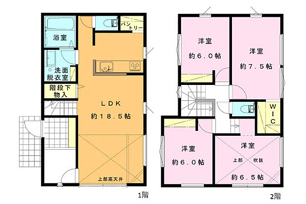 | 間取り | 4LDK 間取り内訳:リビングダイニングキッチン 18.5帖(1階)・洋室 7.5帖(2階)・洋室 6.5帖(2階)・洋室 6帖(2階)x2 |