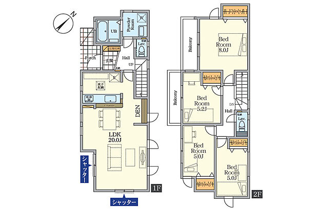 | 間取り | 4LDK 間取り内訳:リビングダイニングキッチン 20帖(1階)・洋室 8帖(2階)・洋室 5.2帖(2階)・洋室 5帖(2階)x2 |