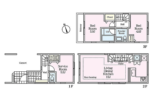 | 間取り | 2SLDK 間取り内訳:収納 5.5帖(1階)・リビングダイニングキッチン 15帖(2階)・洋室 5.9帖(3階)・洋室 4.8帖(3階) |