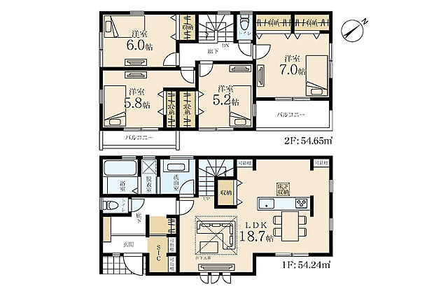 | 間取り | 4LDK 間取り内訳:リビングダイニングキッチン 18.7帖(1階)・洋室 7帖(2階)・洋室 6帖(2階)・洋室 5.8帖(2階)・洋室 5.2帖(2階) |