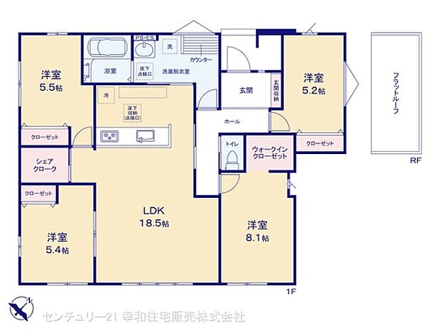 間取り内訳:リビングダイニングキッチン 18.5帖(1階)・洋室 8.1帖(1階)・洋室 5.5帖(1階)・洋室 5.4帖(1階)・洋室 5.2帖(1階)