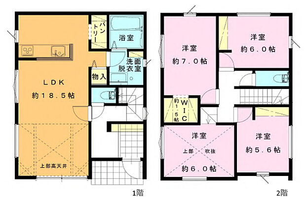 間取り内訳:リビングダイニングキッチン 18.5帖(1階)・洋室 7帖(2階)・洋室 6帖(2階)x2・洋室 5.6帖(2階)