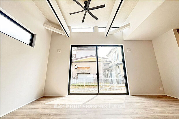 南東向きで明るい陽光がたっぷりと差し込む、開放感あふれる住まいです。 2階の洋室には吹抜けを採用し、天井の高さを活かした伸びやかな空間を演出。