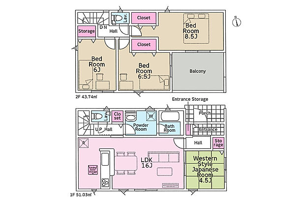 間取り内訳:リビングダイニングキッチン 16帖(1階)・和室 4.5畳(1階)・洋室 8.5帖(2階)・洋室 6.5帖(2階)・洋室 6帖(2階)