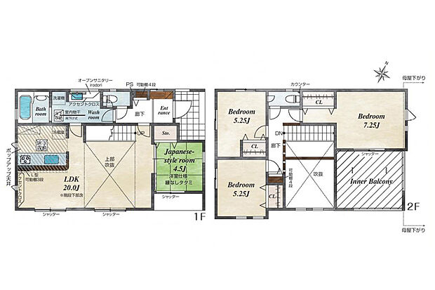 間取り内訳:リビングダイニングキッチン 20帖(1階)・和室 4.5畳(1階)・洋室 7.2帖(2階)・洋室 5.2帖(2階)x2