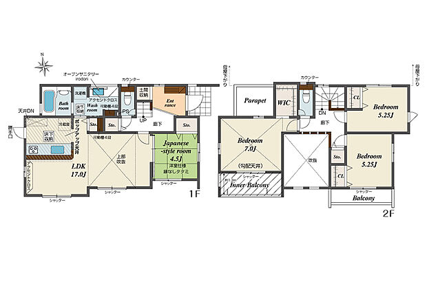 間取り内訳:リビングダイニングキッチン 17帖(1階)・和室 4.5畳(1階)・洋室 7帖(2階)・洋室 5.2帖(2階)x2