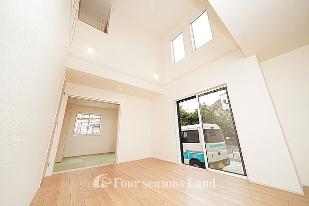 南向き・全室2面採光につき日当たり良好、明るい室内。 LDKは約17帖、吹抜けが施工され開放感があります。 車は3台駐車可能、1台分は来客用としても利用可能です。(車種による)