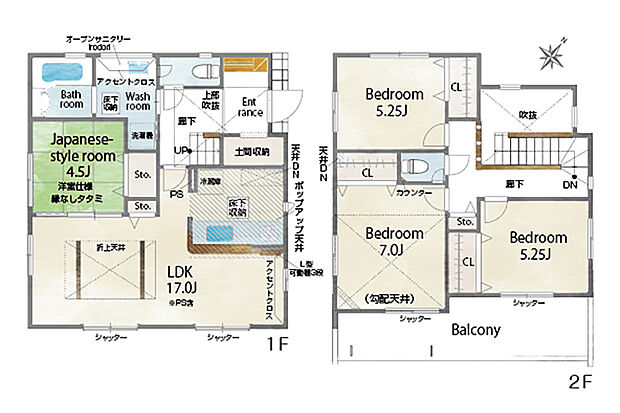 | 間取り | 4LDK 間取り内訳:リビングダイニングキッチン 17帖(1階)・和室 4.5畳(1階)・洋室 7帖(2階)・洋室 5.2帖(2階) |